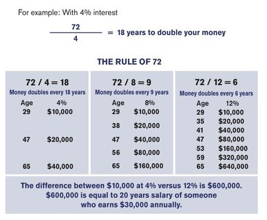 One of the most important discoveries in finance is the rule of 72. Take 72 and divide it by the rate of return. The answer is the number of years it takes to double your money.